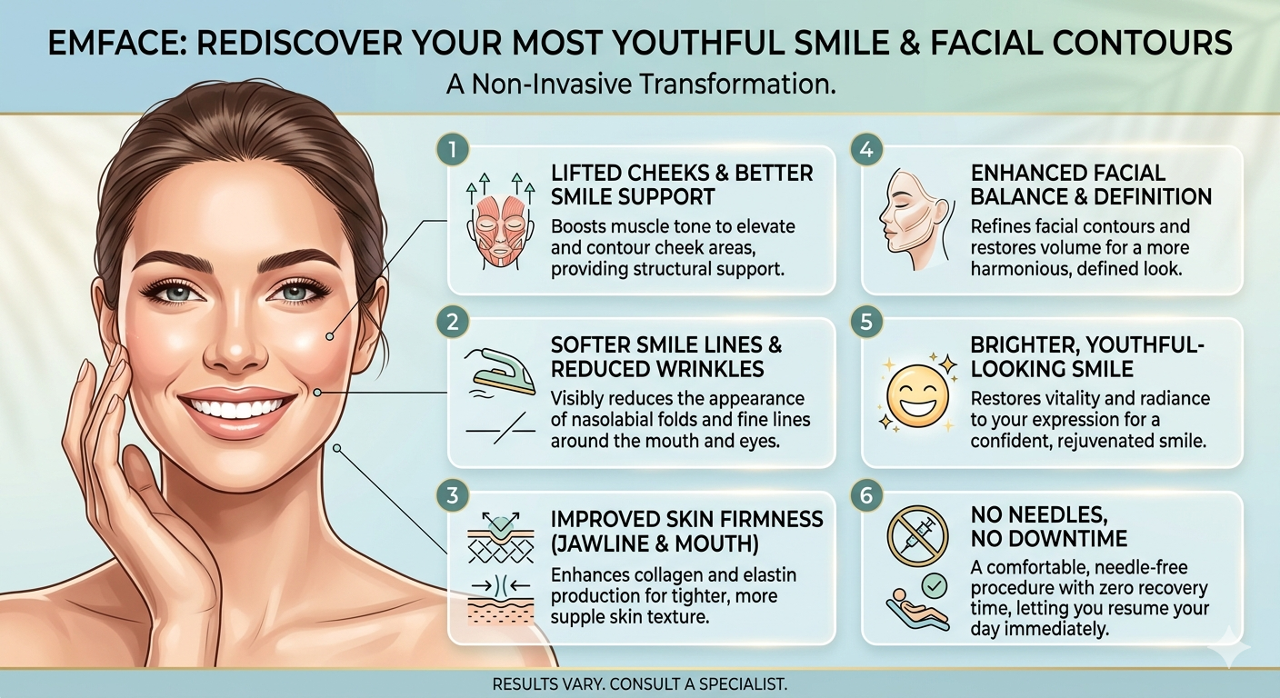EMFACE is a non-invasive facial treatment designed to lift, tone, and rejuvenate the face by targeting both skin and muscle — helping enhance the natural beauty and structure of your smile, all without needles or downtime.